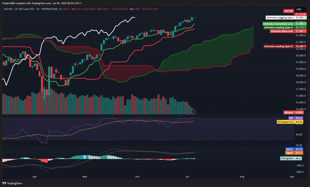 The NASDAQ 100 Index surged to a record high of 22,842 on July 4, 2025, powered by artificial intelligence enthusiasm, resilient macroeconomic data, and rising investor optimism. As Wall Street’s tech-heavy benchmark continues its ascent, investors are asking a critical question: Is this rally sustainable—or running on borrowed time? This article dissects the NASDAQ’s rise through a comprehensive lens of fundamentals, sentiment, and technical structure, providing institutional-grade insight into what’s……