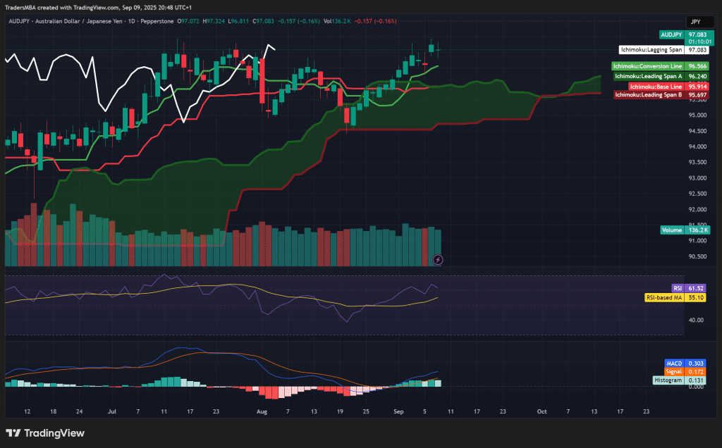 Introduction The Australian dollar continues to outperform as global sentiment steadies, while the Japanese yen remains weighed down by the Bank of Japan’s ultra-loose monetary stance. With AUD/JPY trading above the Ichimoku Cloud and supported by firm momentum, the pair is positioned for further gains in the near term. This article explores the fundamental, sentiment, and technical factors driving the bullish outlook. Fundamental Analysis Australia’s economy is showing modest growth,……