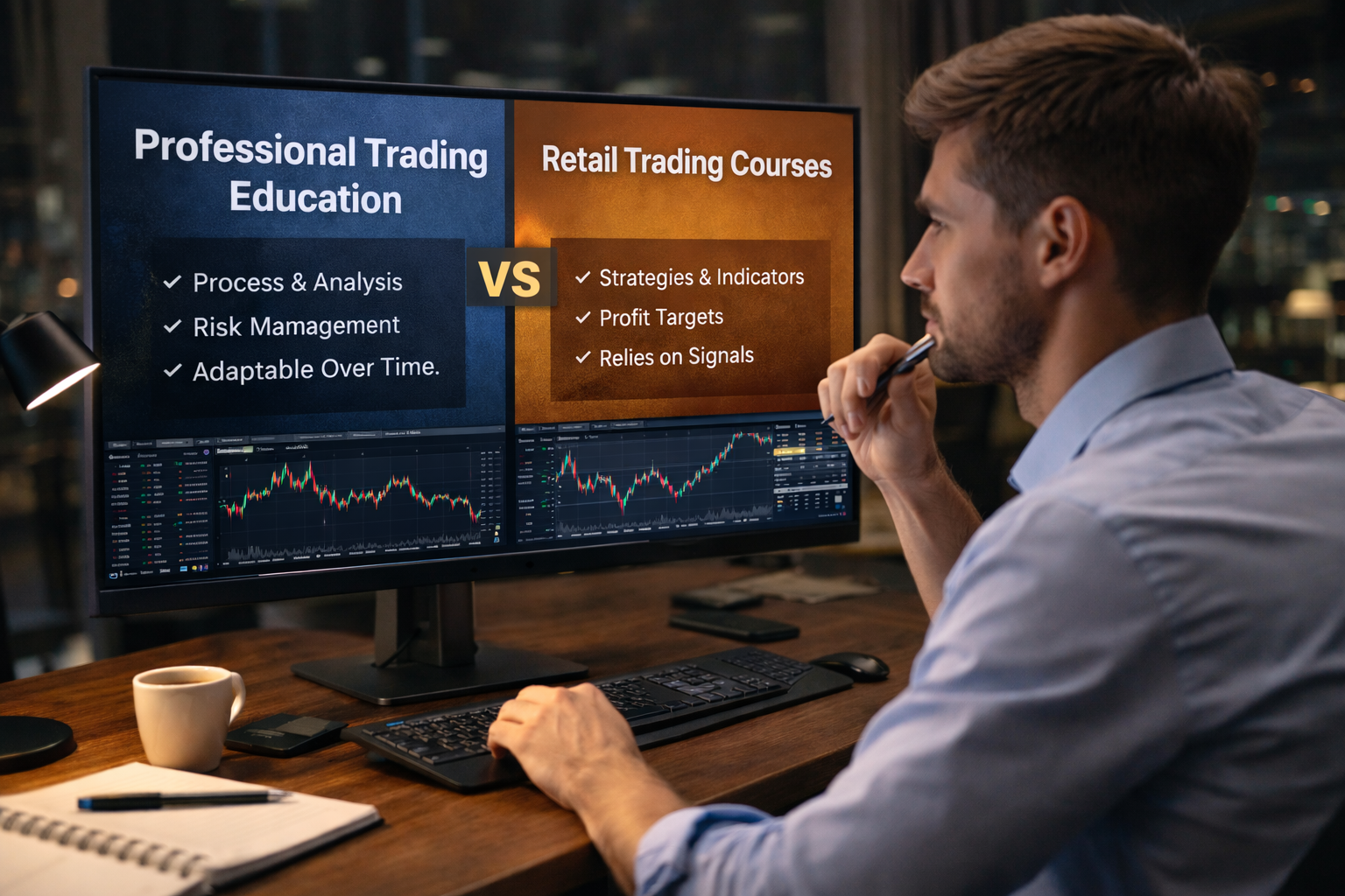 Professional trading education builds process, risk discipline, and decision-making frameworks, while retail trading courses typically focus on strategies, indicators, and short-term tactics.